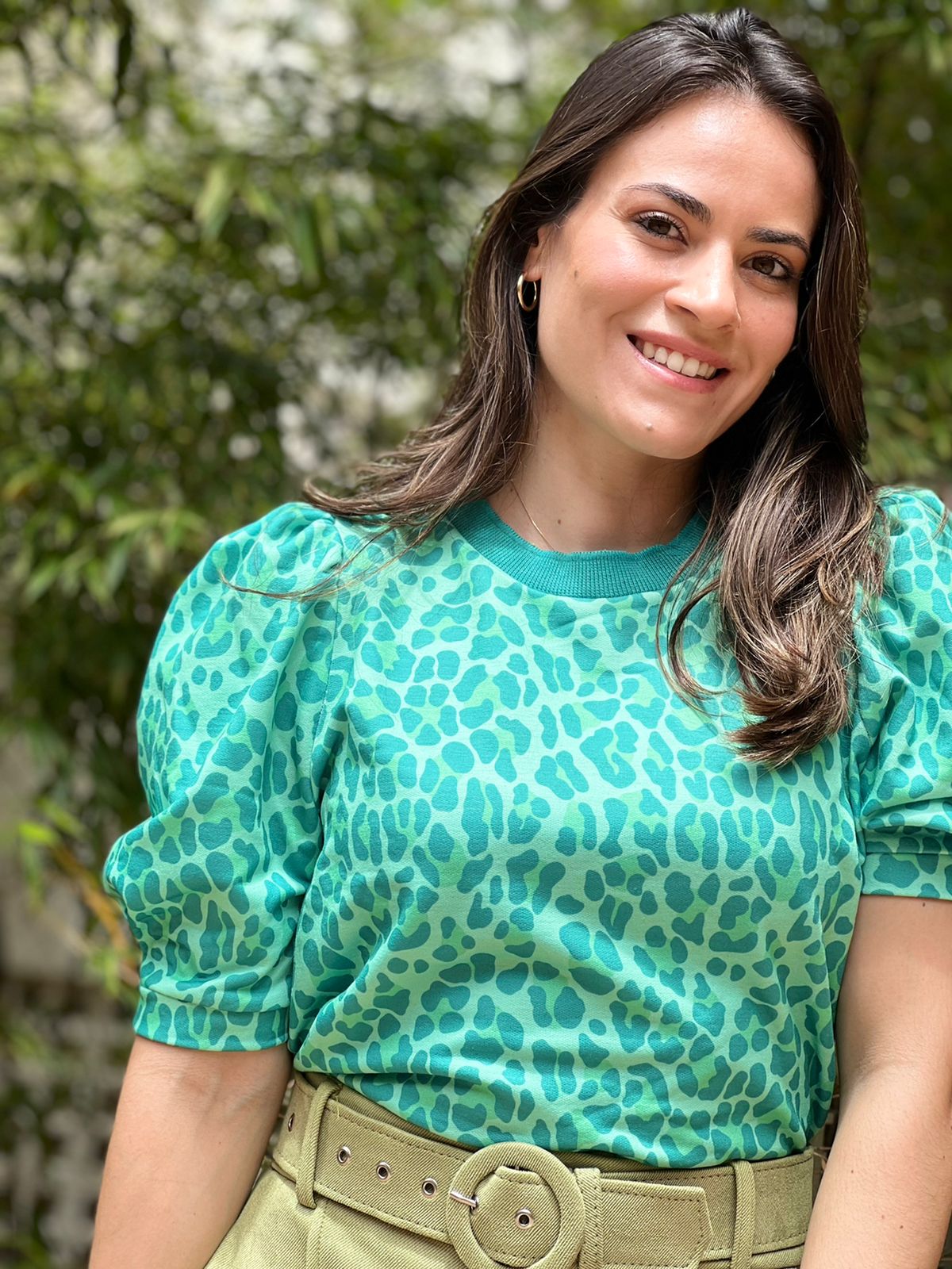 Blusa Animal Print em moletinho, com manga bufante e gola em cor única.