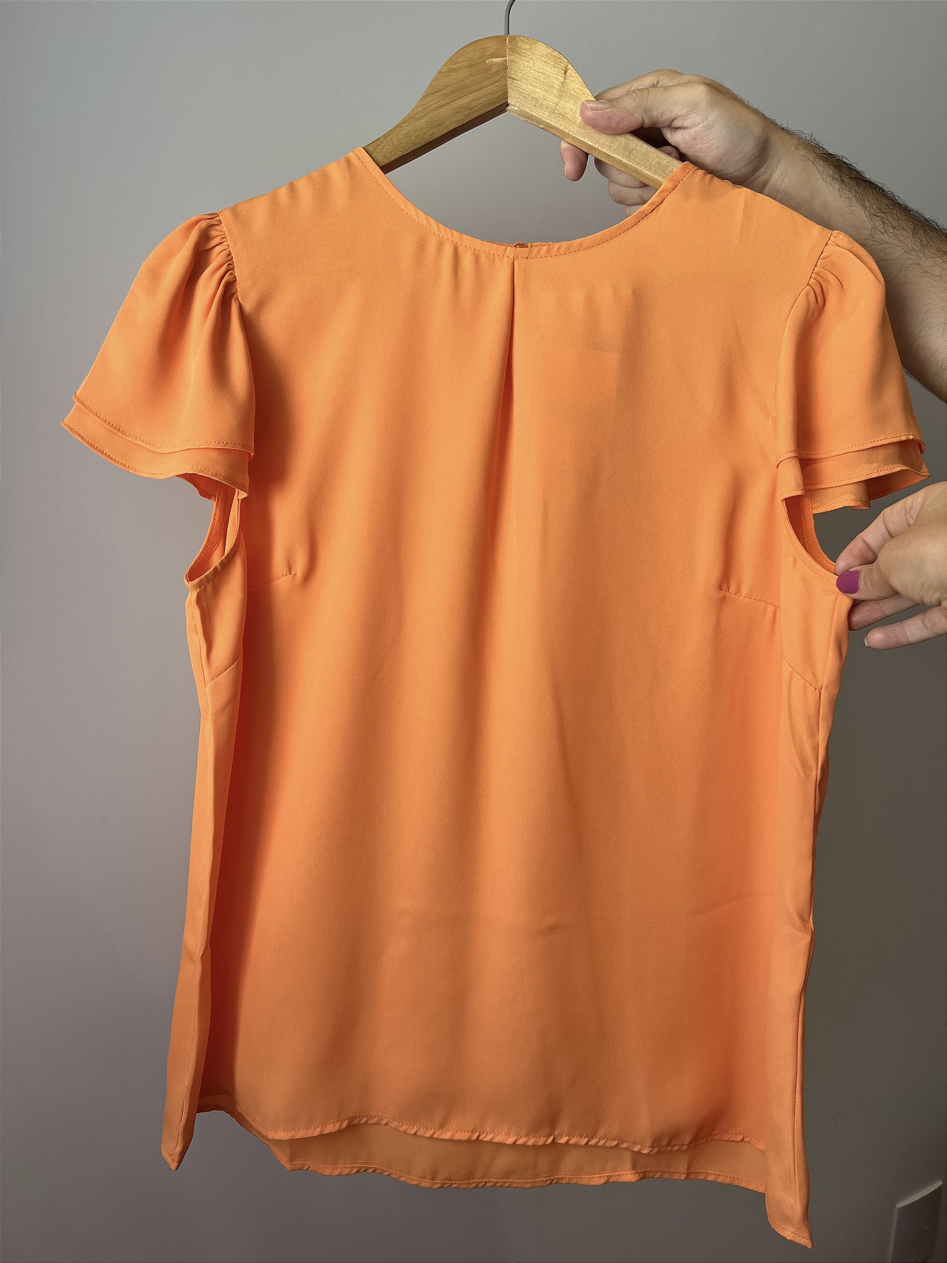 Blusa manga curta, com manguinha copo dupla, detalhe prega, detalhe de abertura e fechamento na parte anterior do pescoço com botão.