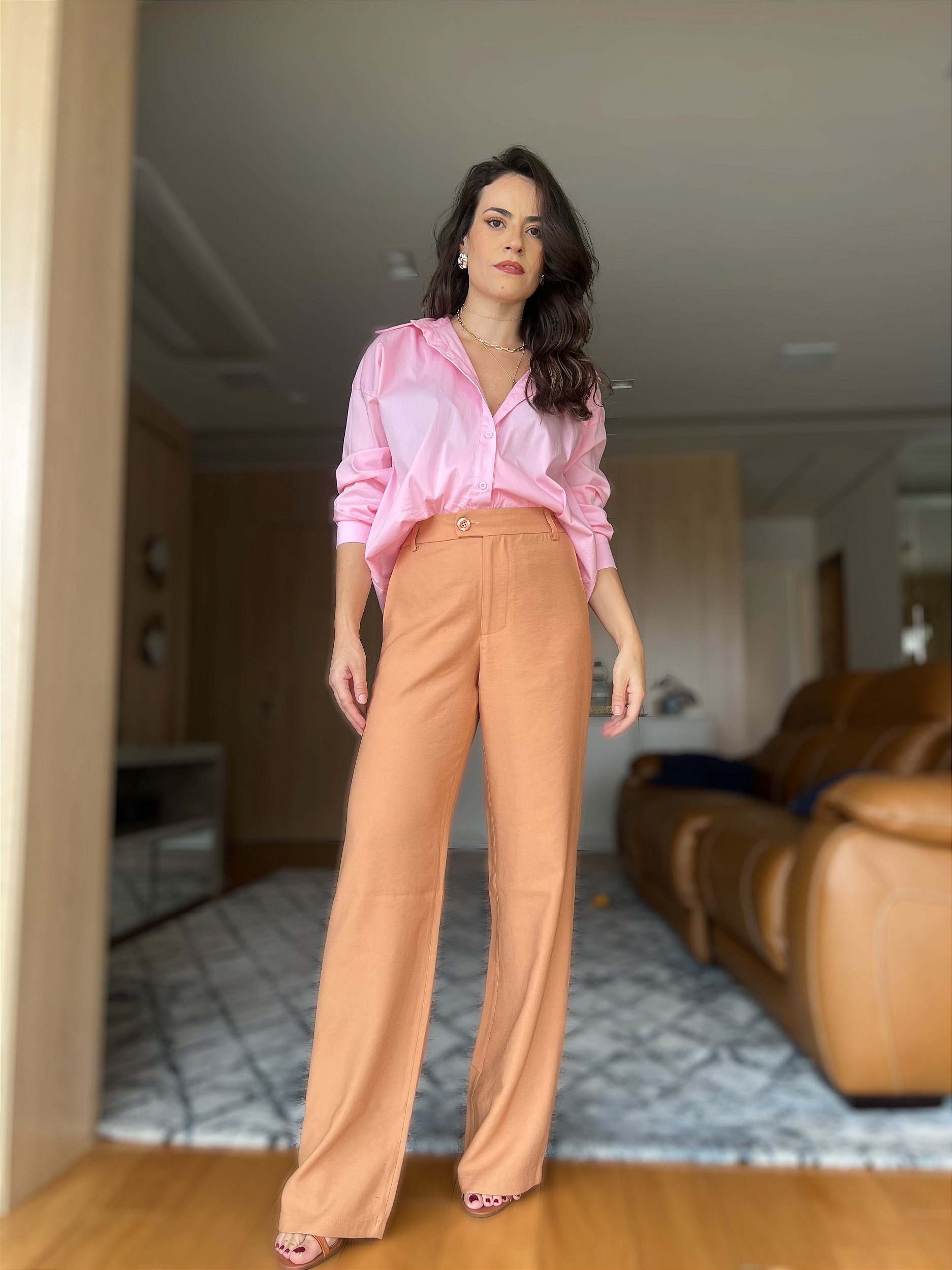 Calça com recorte reto, pernas soltas, com bastante movimento, fresca em razão da composição, conta com bolsos faca frontais funcionais e embutidos falsos na parte traseira, valoriza muito a silhueta. A cintura é média alta, com fechamento por botão cintilante, no cós transpassado.