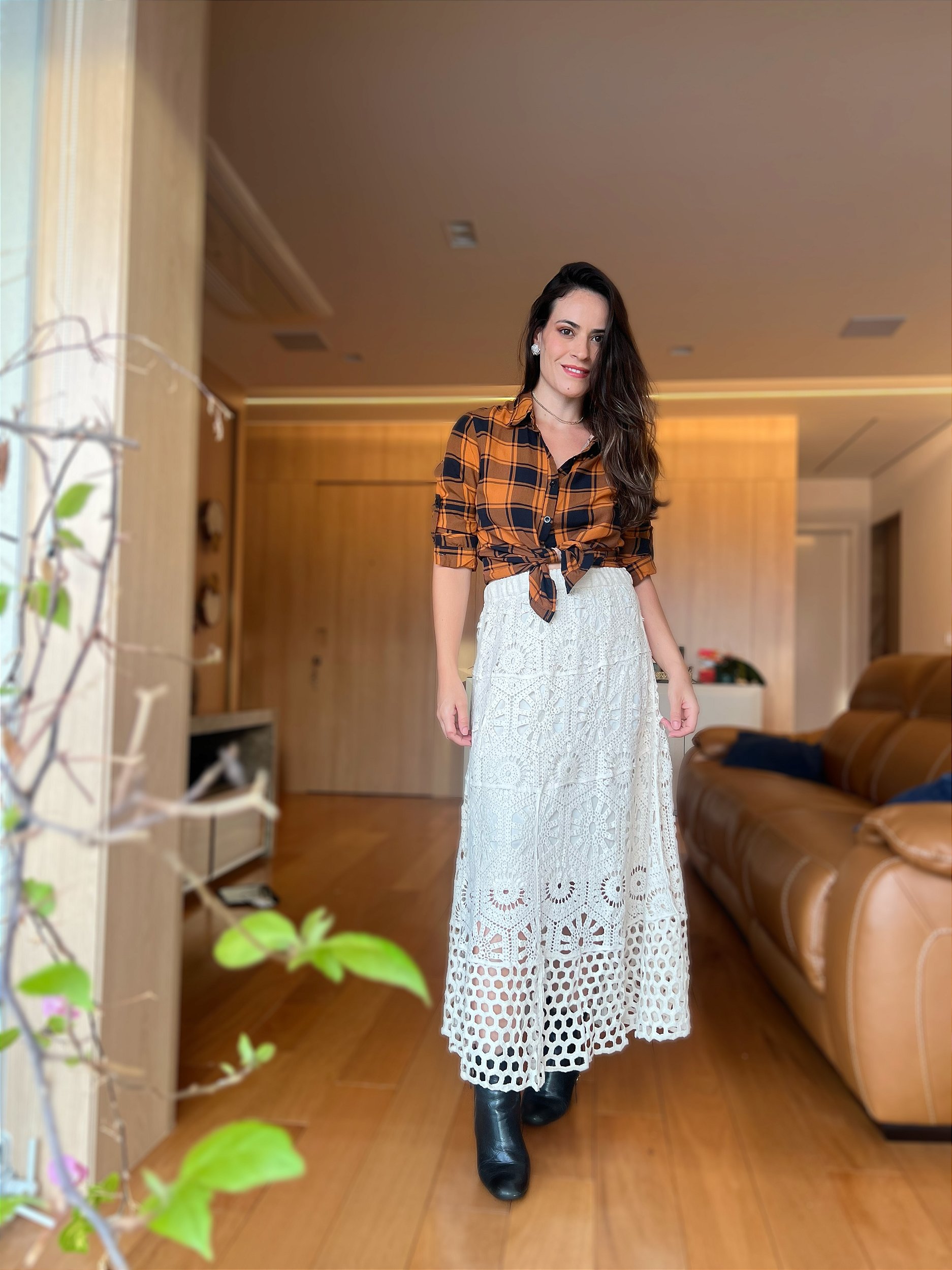 Camisa xadrez, preta e caramelo, com colarinho e botões tingidos para fechamento frontal e nos punhos. Tecido leve, fresco que permitem utilizá-la durante todo o ano, também em razão da padronagem clássica em cores neutras. Comprimento médio.