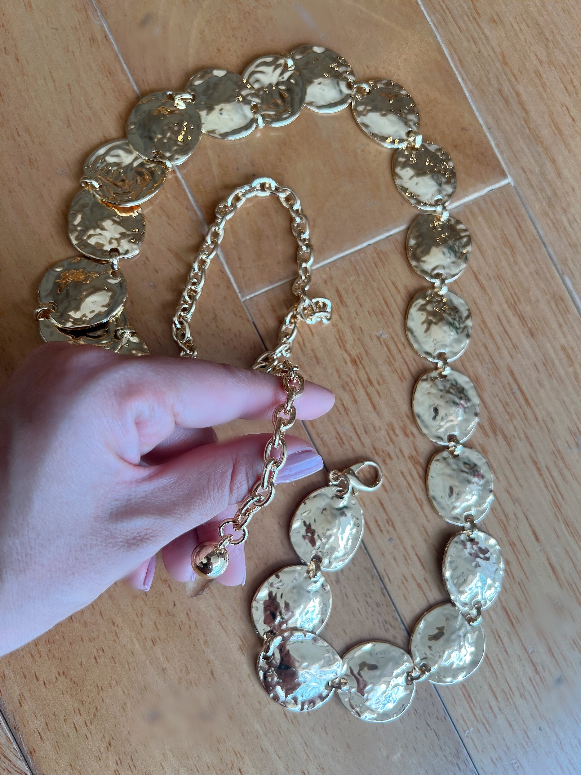 Cinto Medalhas, em medalhas marteladas, levemente abaloadas, corrente com elos estilo cartier, e ponteira de esfera metal dourado. Corrente alongada para ajuste em variadas medidas.