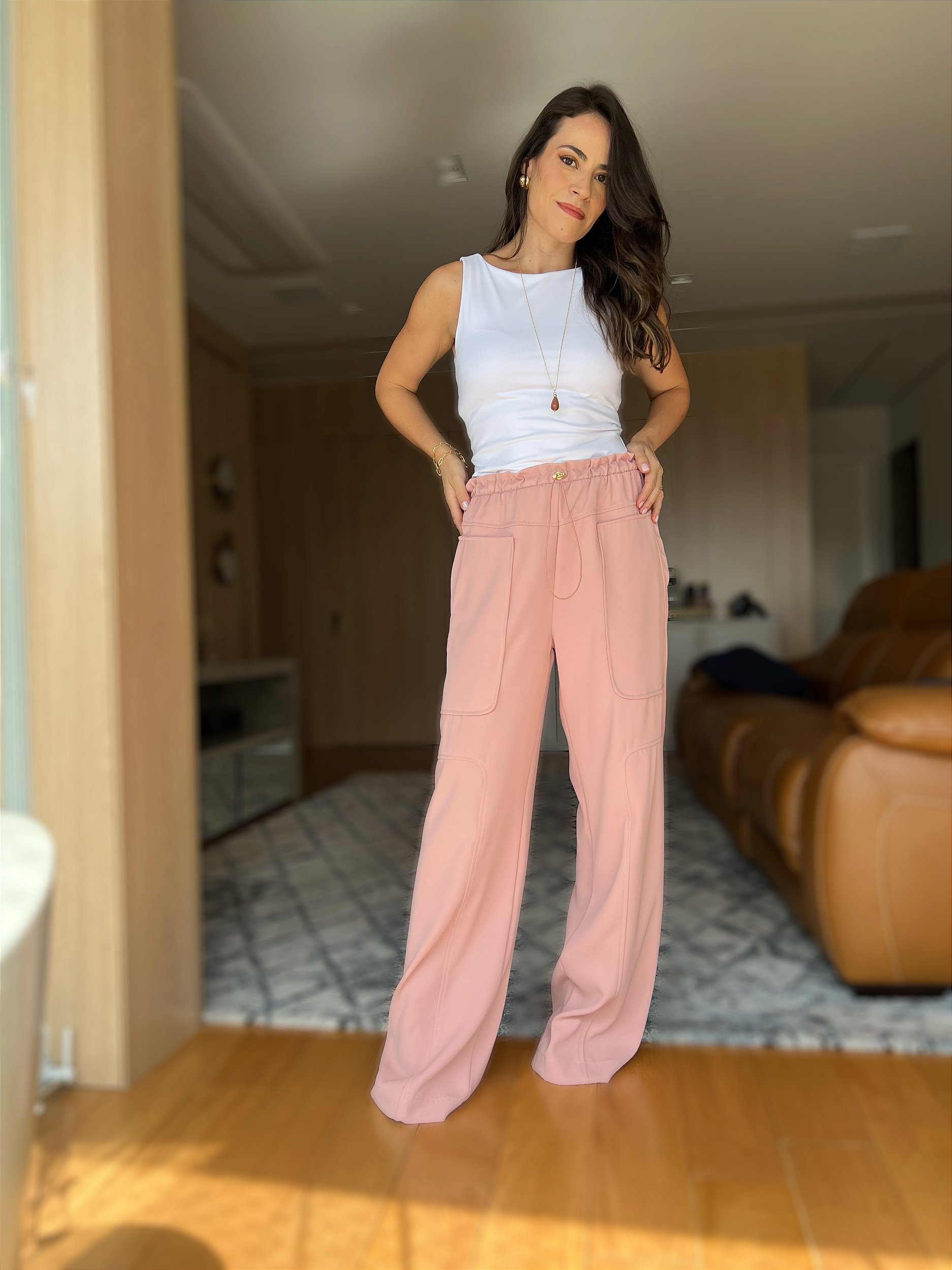 Regata em poliamida e elastano com parte frontal do busto dupla, com acabamento da costura da gola e cava, frontais, embutidas, nao aparentando costura (o que torna a regata clean, com visual mais elegante), comprimento médio, cavas retas, que disfarçam gordurinha.