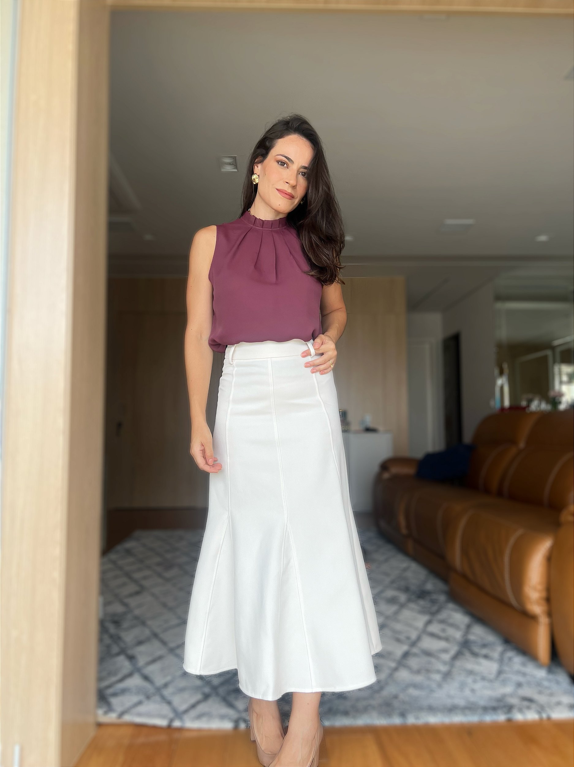 Saia em alfaiataria encorpada, toque macio, passantes no cós, recortes frontais e posteriores, dando o efeito sereia , zíper invisível na lateral, trazendo um visual clean, entretelada. Cintura Alta. Traz um visual elegante e uma silhueta desenhada.