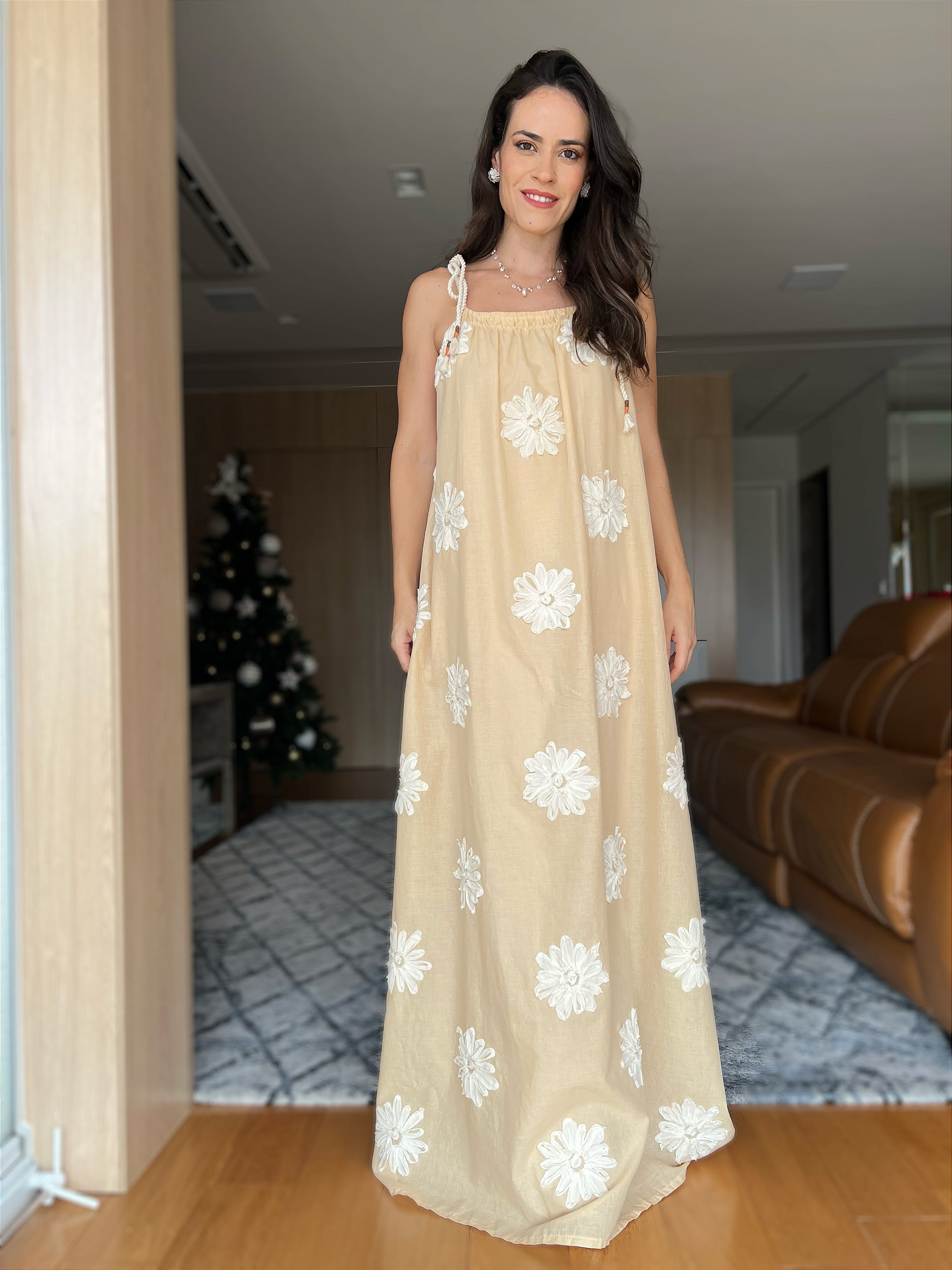 Vestido em modelagem ampla e com alças de amarração, sendo ajustáveis a altura do decote e cava conforme amarração. Algodão em gramatura fina, leve , com flores bordadas em tecido também 100% algodão, mesma gramatura e cor mais clara conta com forro até a barra.