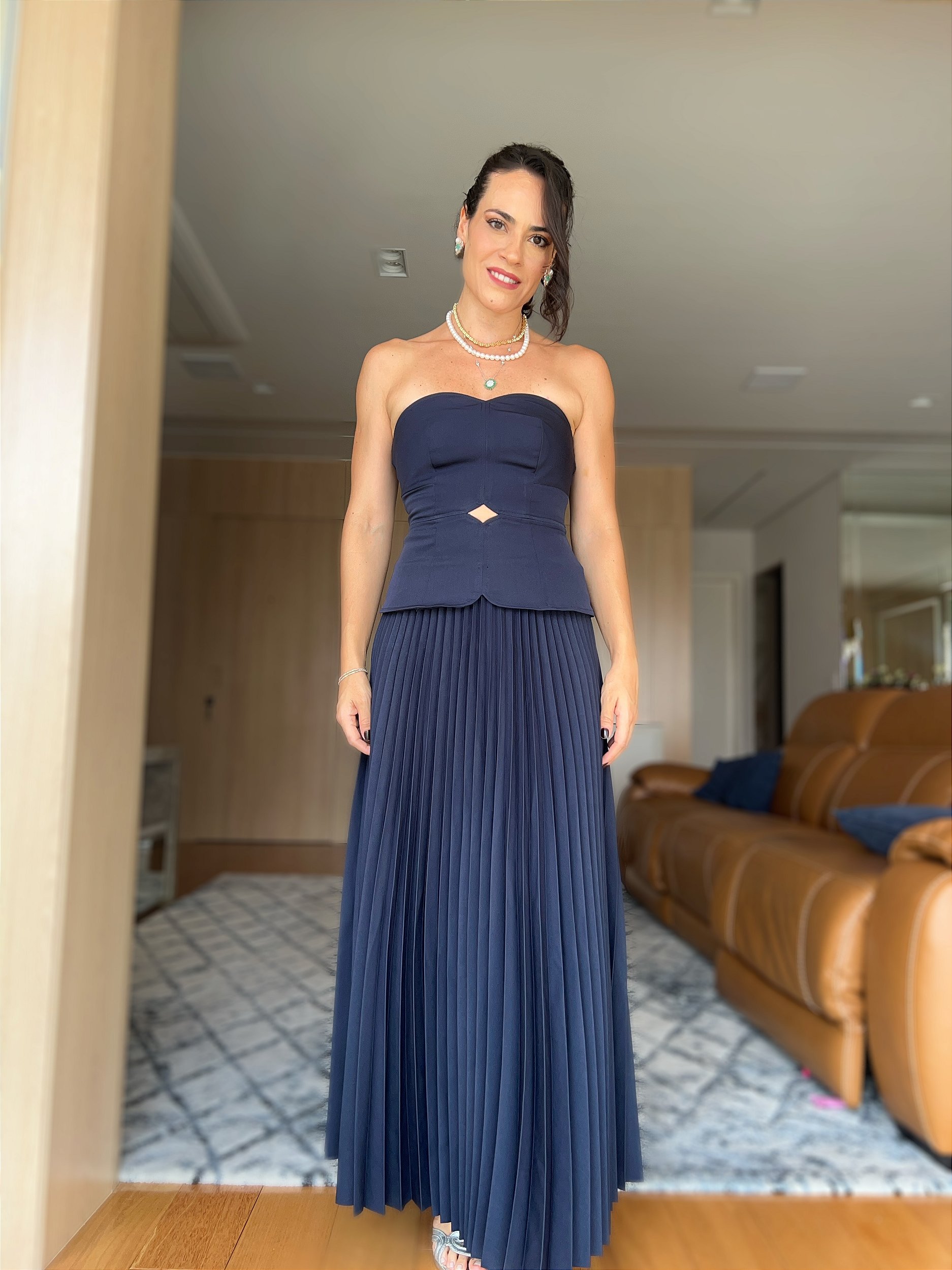 Vestido Plissado, confeccionado em alfaiataria com elastano, gramatura grossa, caimento pesado com fluidez, equilibrando estrutura e movimento. Comprimento midi, com busto que lembra um corset , trazendo uma silhueta acinturada. Conta com sutil recorte cut-out no centro do corpo, e flui para uma saia inteiramente plissada. Vestibilidade facilitada pela abertura em zíper nas costas (com aviamento delicado e zíper mais imponente) .